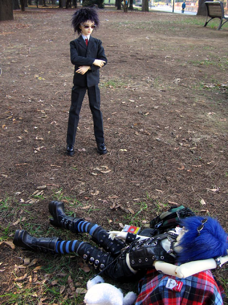 | ??: Hey you. Raziel: Hmmm? You mean me? ??: You see anyone else around here? Yeah, I mean you. Raziel: Sorry. ^^; ??: You seen a kid go running past here? 'Bout sixteen, long black curls, dressed all in black. | |